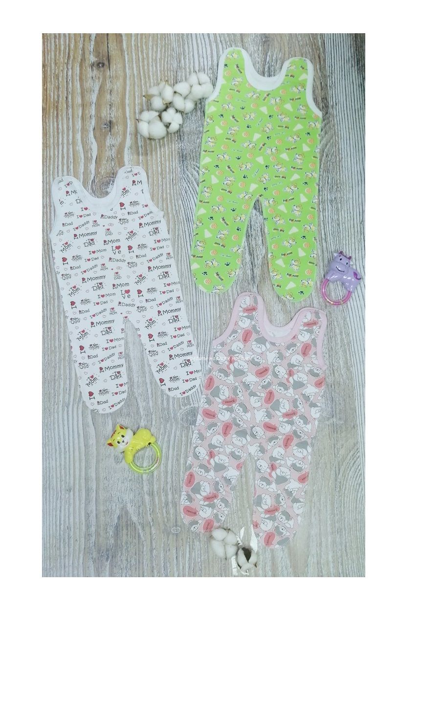 Ползунки с кнопочками на плечиках. В каждой упаковке и партии расцветки отличаются.